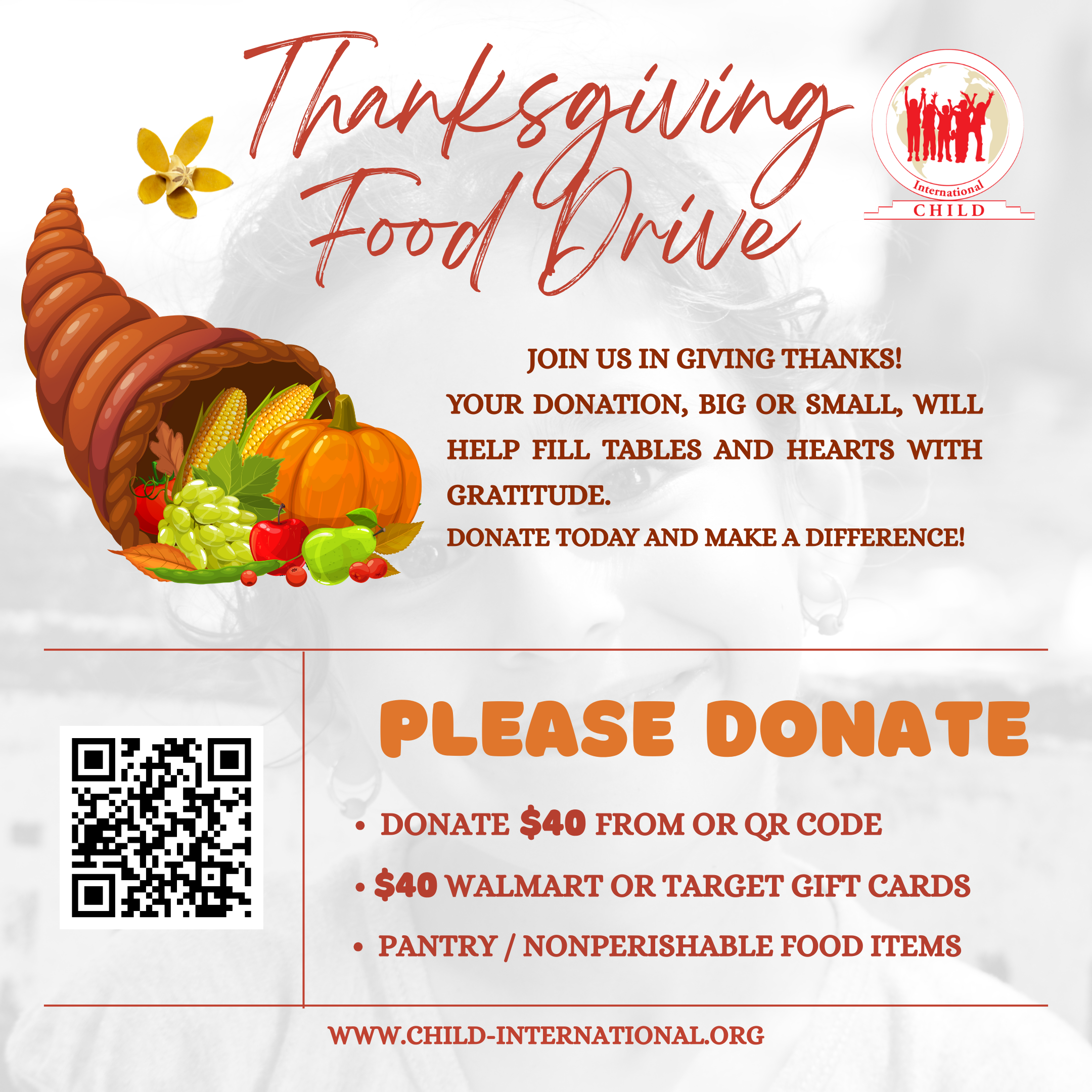Thanksgiving is a time for togetherness and gratitude. Our annual Food Drive ensures that over 300 children and families in our programs can celebrate with a warm meal, benefiting our Adopt-a-Family and Refugee Relief program.